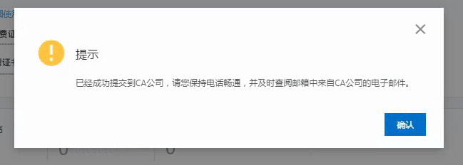 最后,会弹出一个提示信息,表示已经成功了,只需要等待十分钟左右,证书就下来了